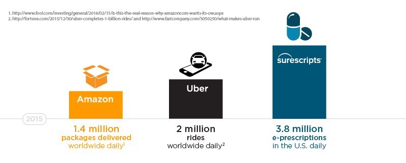 In 2015, Surescripts drove a massive digital shift in healthcare, processing 9.7 billion transactions across our nationwide health information network. In fact, each day, we processed an average of 3.8 million electronic prescriptions in the United States, surpassing giants Amazon (3 million packages each day) and Uber (1 million rides each day worldwide).